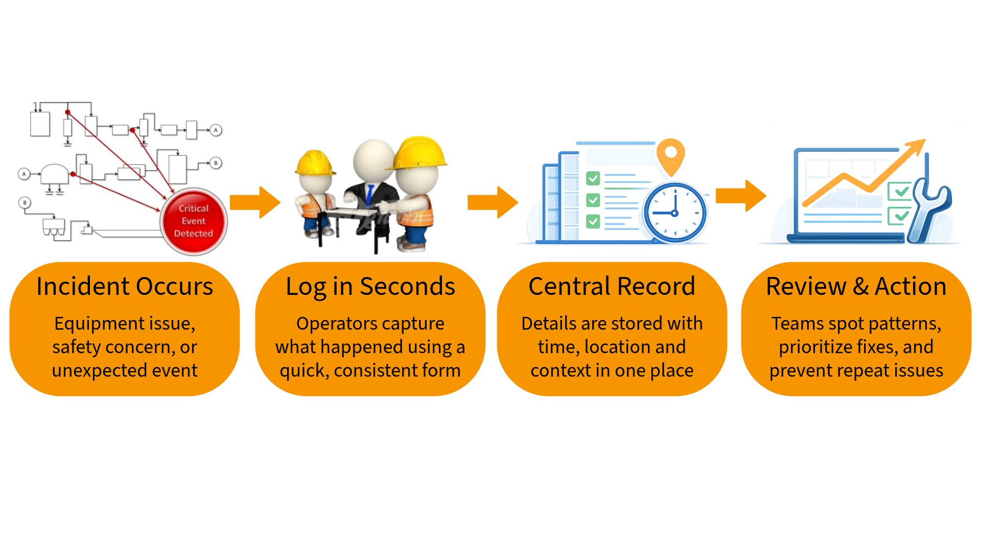 Capture: Operators or supervisors log what happened using a quick, consistent form.